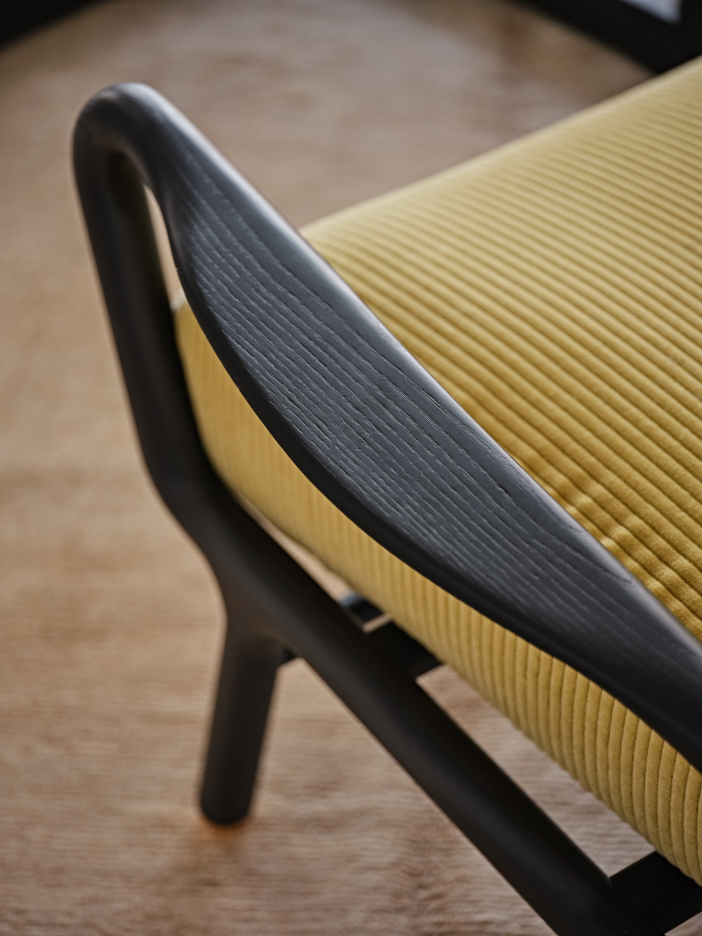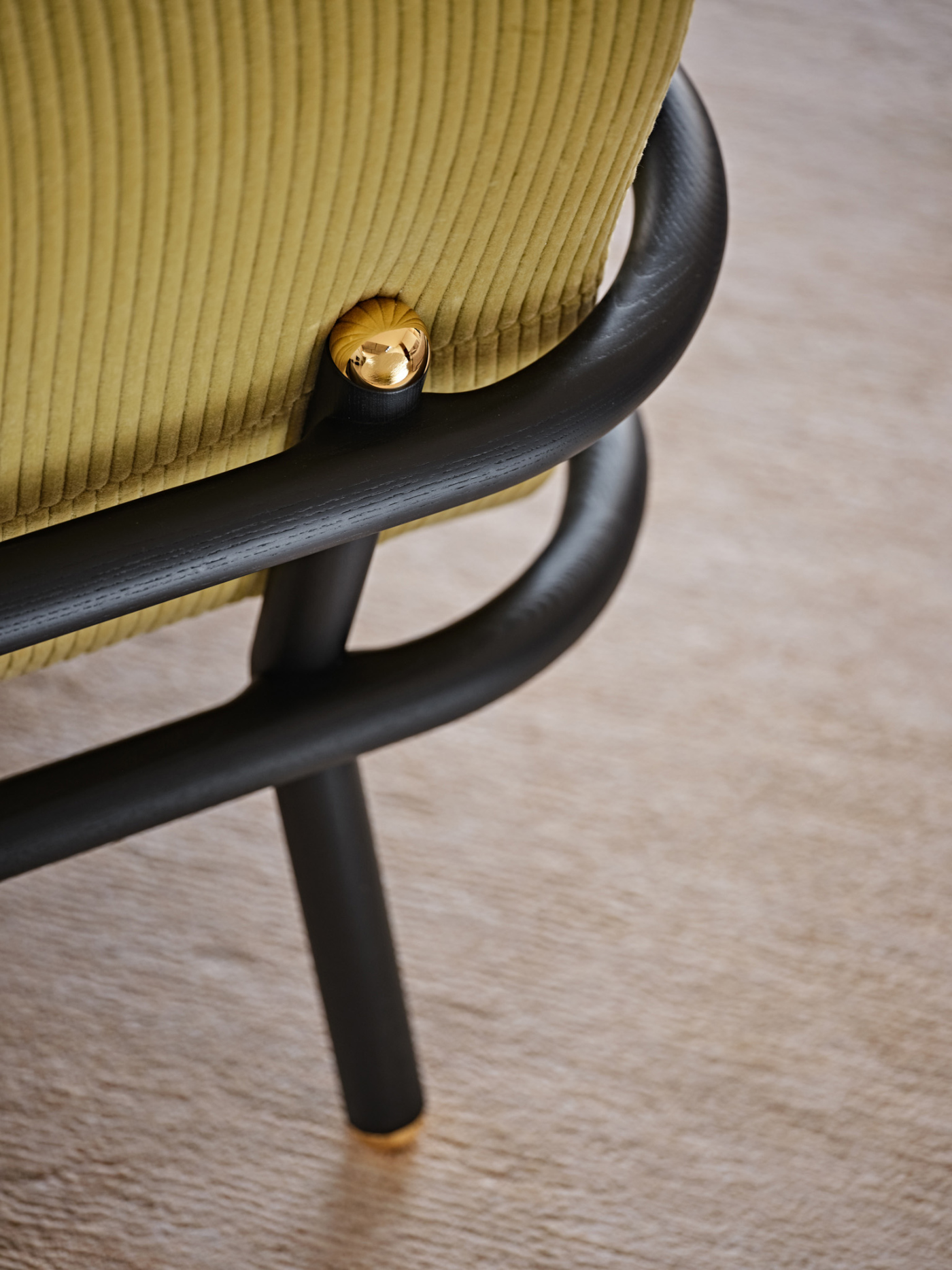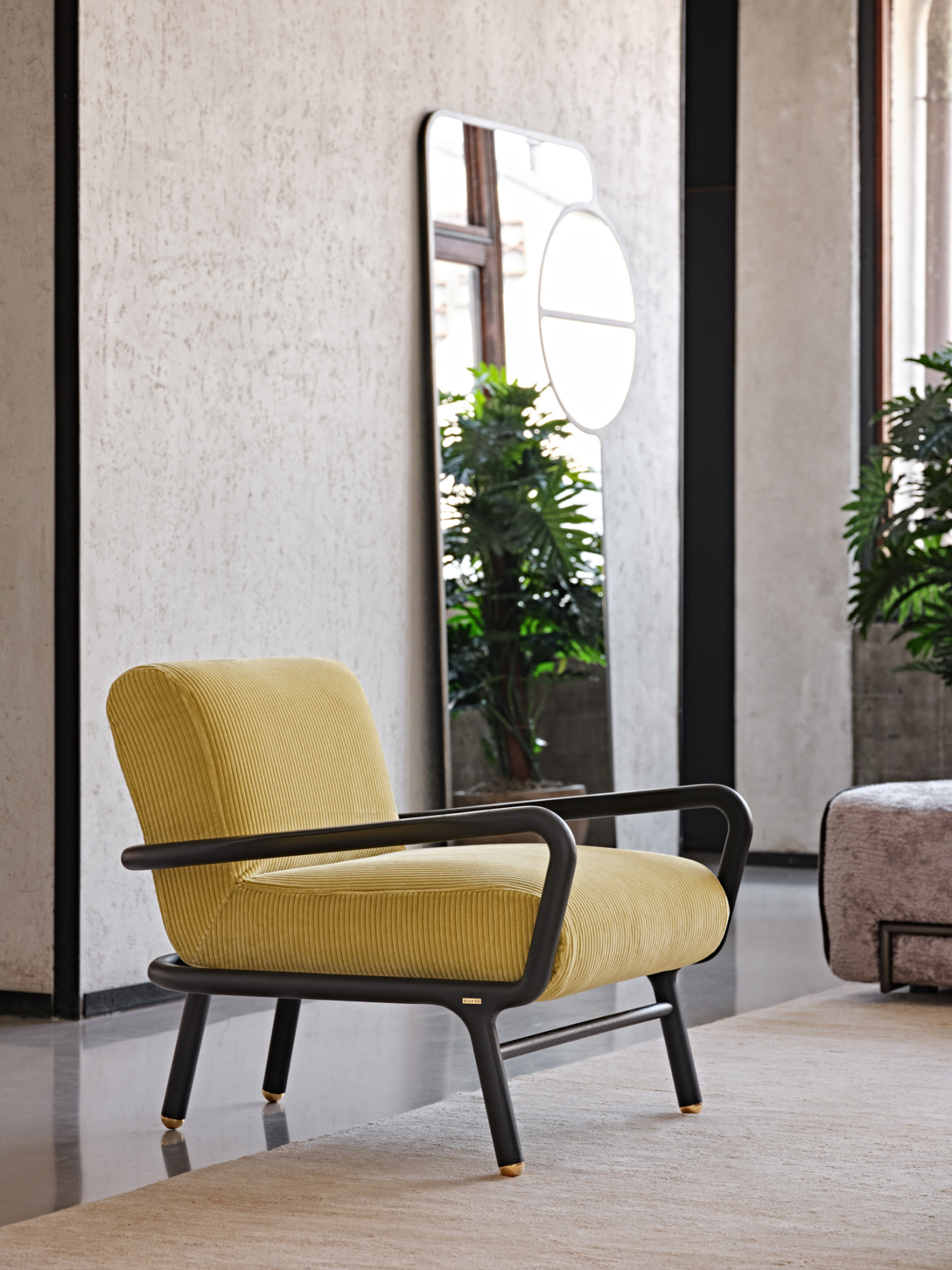 The delicate relevance of details: Girò is an armchair that can be the absolute centerpiece, as well as discreetly accompanying the most diverse living compositions with elegance. It stands for its structural lightness: the solid Ash wood seems to be bent with unexpected flexibility, in a harmony of lines and perfect angles matching the perfect size of the armrest. Not too much, not too little. The detail of the backrest and foot in polished gold finishing underlines the taste for style of those who choose Girò.