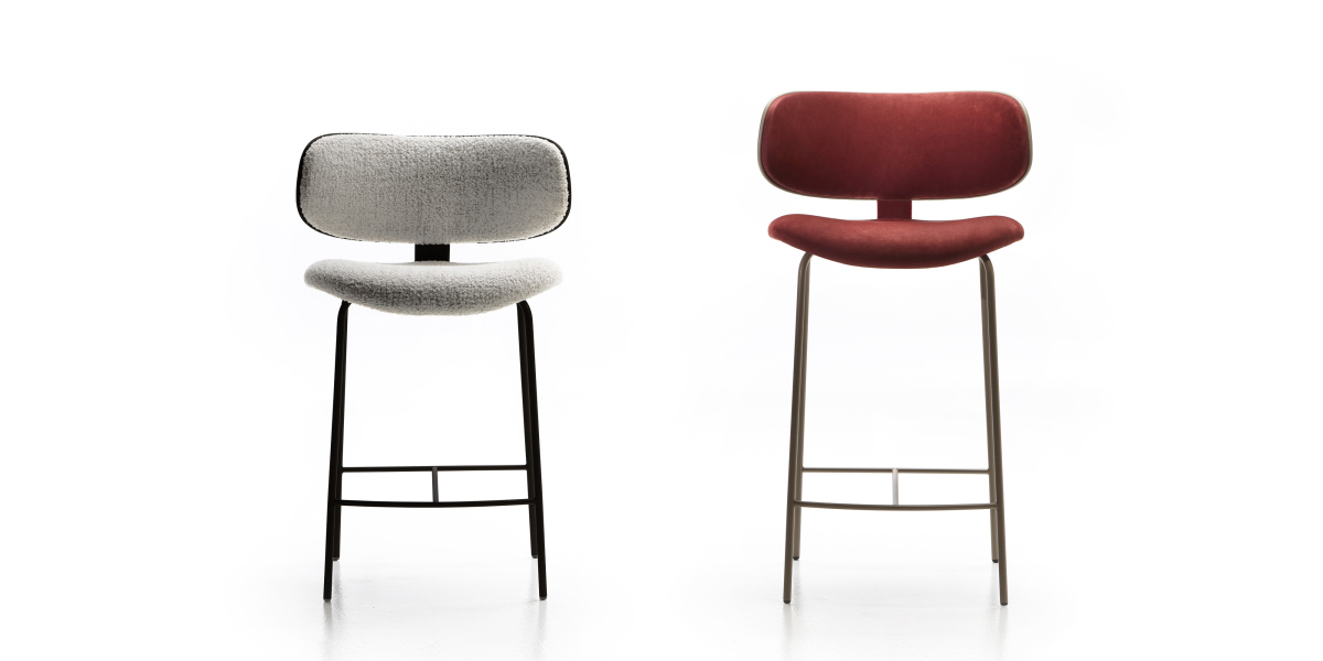 Simply essential: Natalia is pure form and fabric. The inclination of the seat harmoniously complements the backrest, which envelops and supports with delicate elegance. The quality of the fabrics and leathers, which can be customised with a wide range of fine materials, is further enhanced by the ecoleather details that harmoniously accompany the painted metal frame.