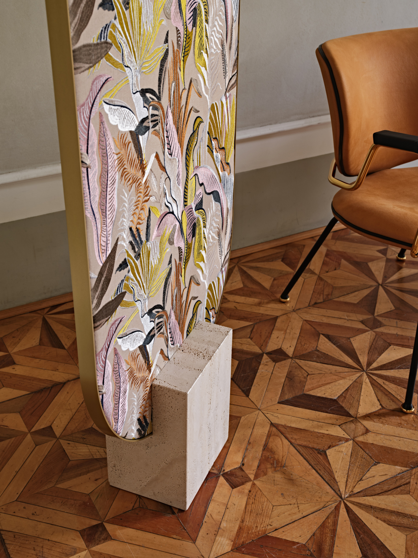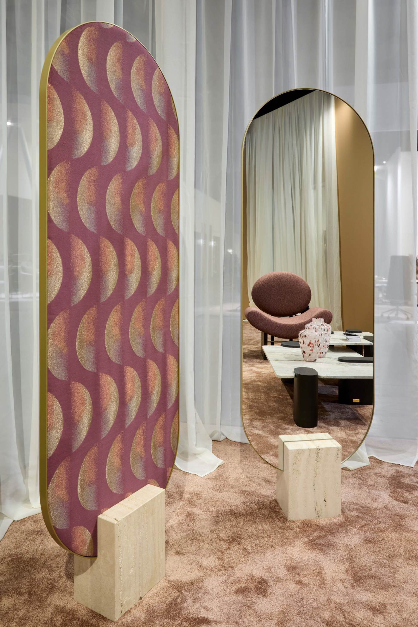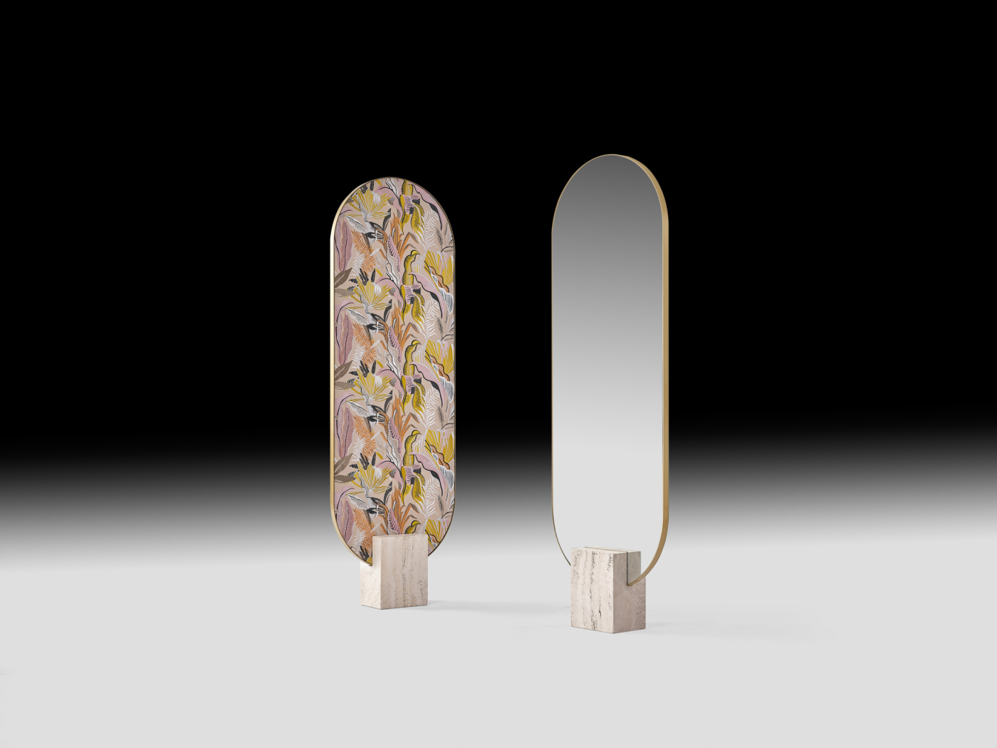 Its majestic travertine base stands as a monument to strongness where the curved-shaped mirror rests like a harmonious insertion in the rock in full balance. It is an interplay of contrasts, a harmony between the hardness of the stone in its massive base and the softness of the mirror's curved shape. On the back its fabric-wrapped surface presented here in fascinating versions invites you to explore and touch.