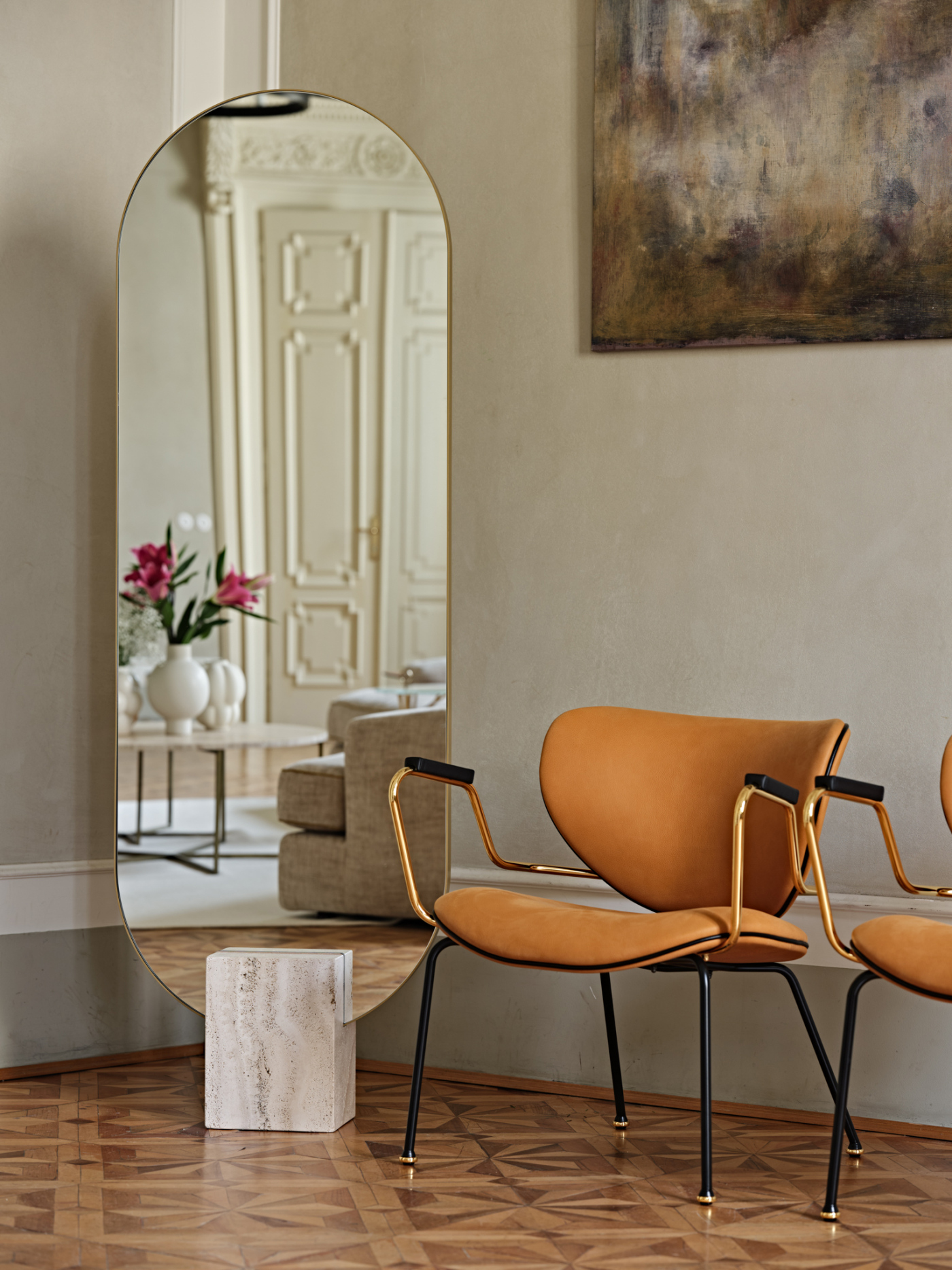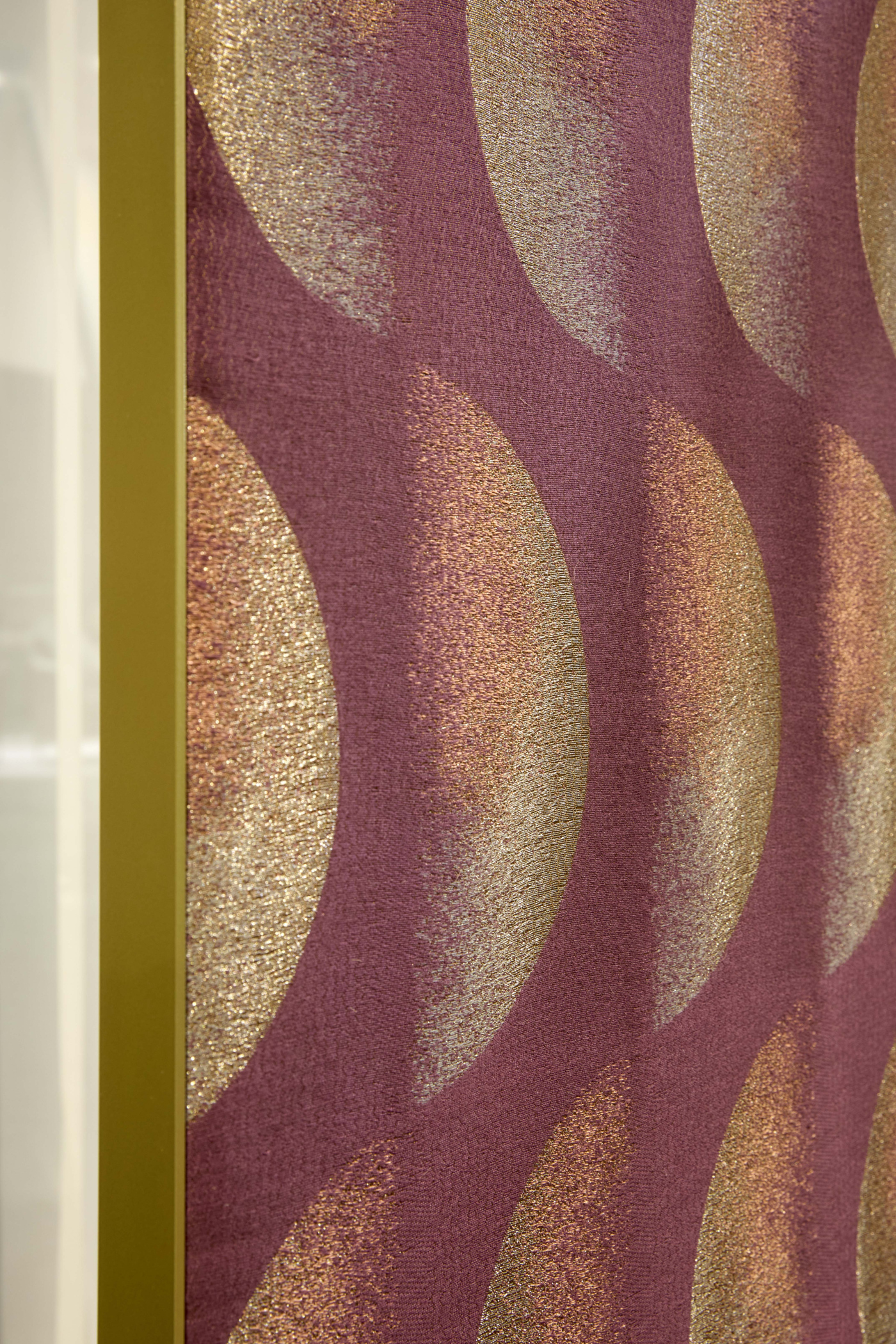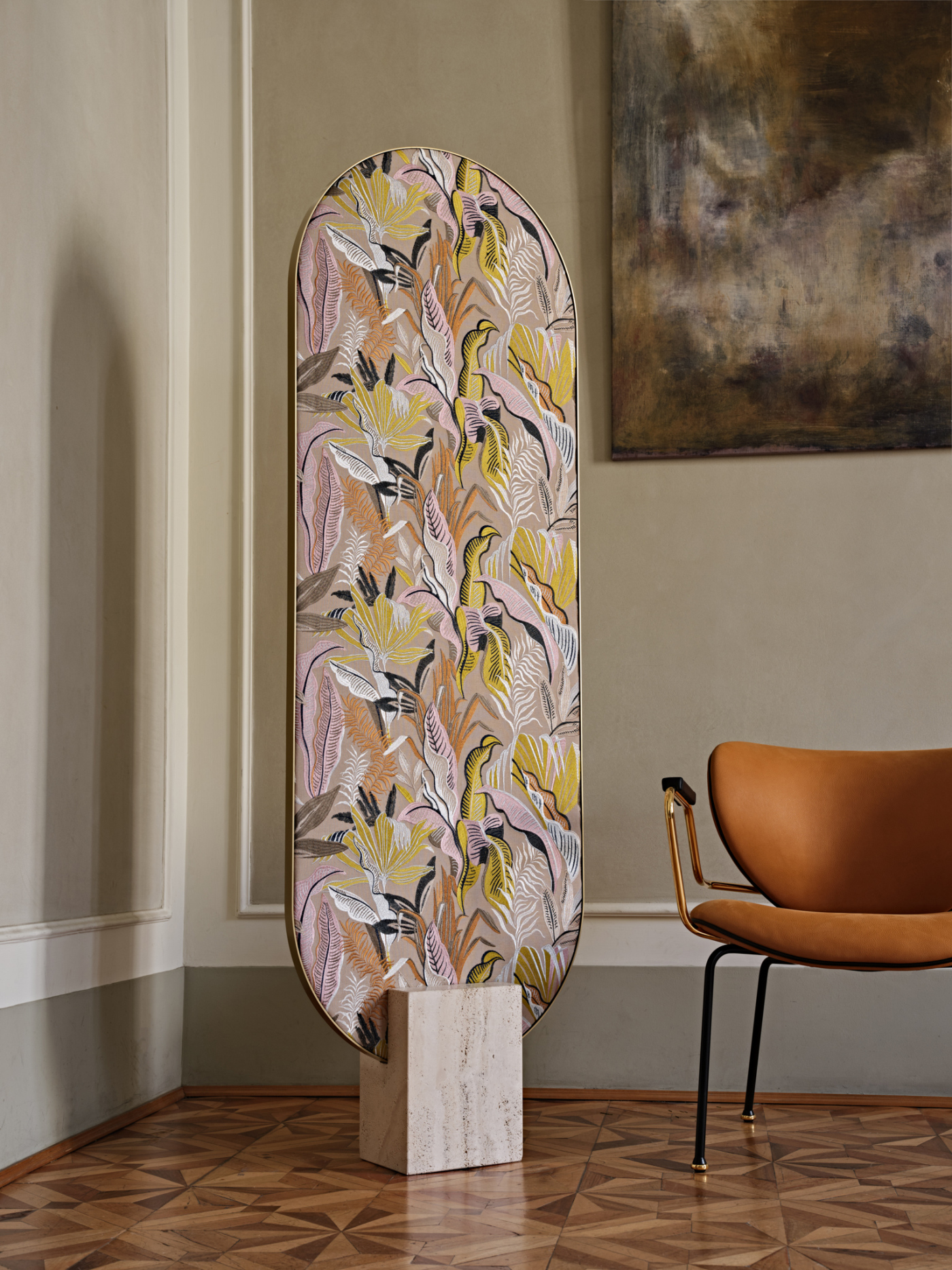 Its majestic travertine base stands as a monument to strongness where the curved-shaped mirror rests like a harmonious insertion in the rock in full balance. It is an interplay of contrasts, a harmony between the hardness of the stone in its massive base and the softness of the mirror's curved shape. On the back its fabric-wrapped surface presented here in fascinating versions invites you to explore and touch.