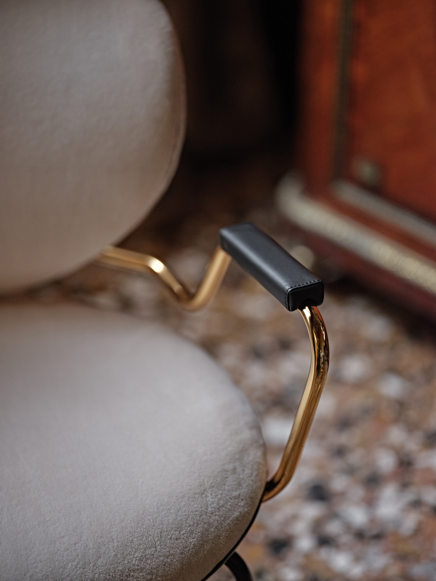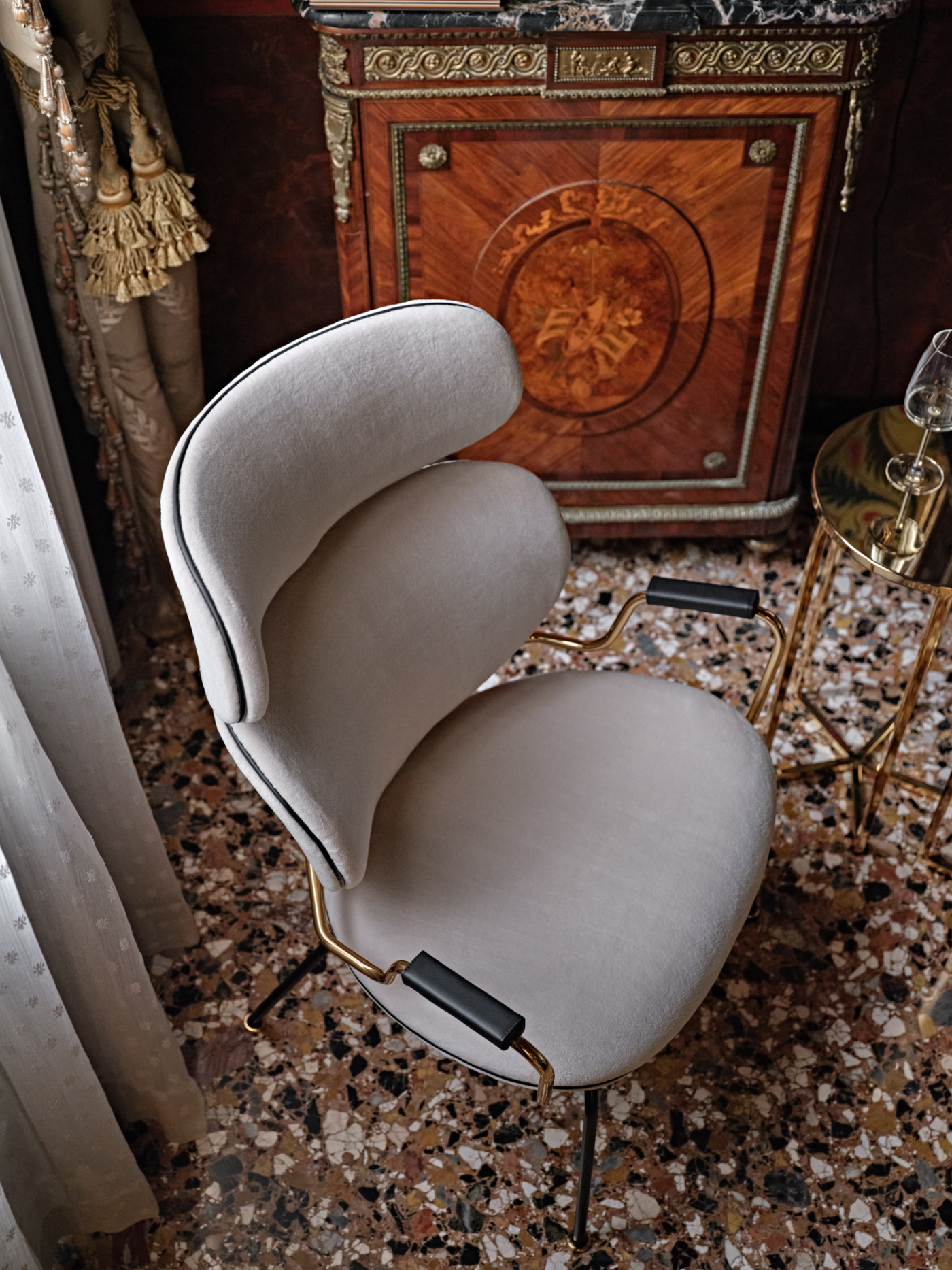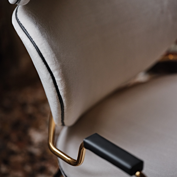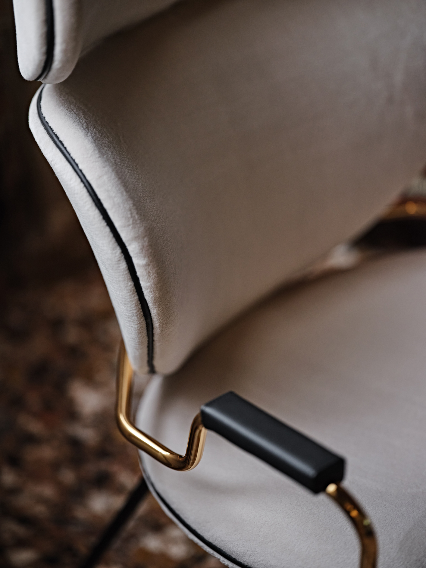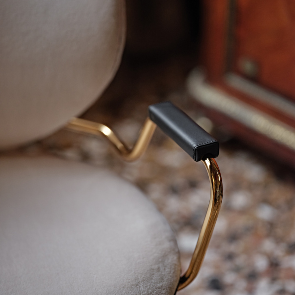 Asia, nella sua rigorosa austerità, è una poltrona dallo spirito office che sa conferire anche al contesto domestico un’aurea di regale e calibrato relax. Il morbido pellame si adagia alla linee sinuose delle forme, che accolgono una seduta confortevole, impreziosita ulteriormente dal dettaglio del bracciolo in finitura oro lucido che cinge con delicata leggerezza lo schienale. La struttura delle gambe sorregge con padronale rigore la seduta e si lascia impreziosire dal dettaglio del piedino in oro lucido, in dialogo con la sottile eleganza dell’elemento bracciolo.