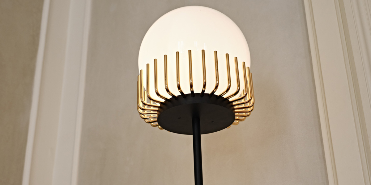 Catturare gli astri è un sogno effimero, degno delle migliori narrazioni e interpretazioni artistiche: Lucy Freestanding, grazie al sapiente gioco di equilibri tra gli elementi, sa donare all’ambiente un effetto onirico regale e naturalmente armonioso. I due corpi illuminanti, sorretti con delicata eleganza dalle corone in oro lucido, sembrano quasi fluttuare grazie alla leggerezza dell’asta nera opaca. La luce generata dal vetro opalino pervade così l’ambiente, con elegante sobrietà.