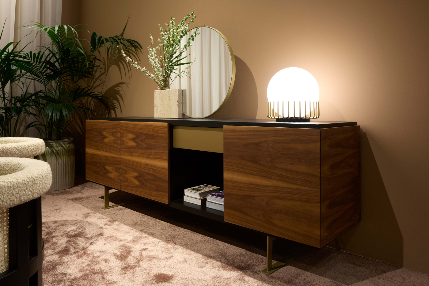 Rigore e sostanza: la madia Sira è un elemento prezioso, che sa inserirsi con silenziosa personalità negli ambienti di pregio, per contenere oggetti segreti, sostenendo gli sguardi più esigenti. La firma dell’insostenibile leggerezza dell’essere eleganti di Black Tie risiede anche nel lusso armonioso delle finiutre: dall’oro opaco dei piedini al noce canaletto delle ante.