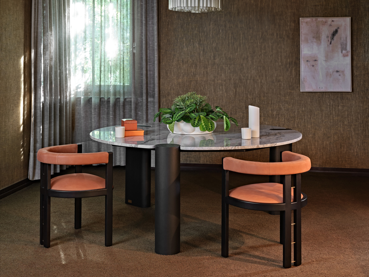 Materia sospesa in un equilibrio gravitazionale: il pregio del tavolo Amoris è nel gioco di forme perfette, che si alternano armoniosamente nel sostenere, in un’illusoria assenza di peso, la pre-gevolezza del marmo e della quarzite. Materiali preziosi in incastri raffinati, che sanno sottoline-are con plastica eleganza le scelte di stile che ge-nerano stupore.