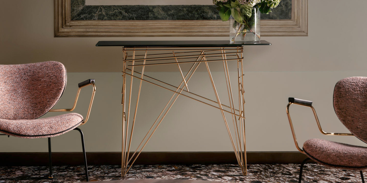 Quando un mobile diventa un’icona, il suo stile si riconosce al primo sguardo: la personalità coraggiosa del top in vetro retrolaccato Blue-black, Rosso fuoco o Bianco grigio è sorretta con perfetta armonia dal gioco-scultura delle sottili gambe in acciaio finitura oro lucido o cromo scuro. Una consolle per ambienti molto esigenti e dalla grande personalità.