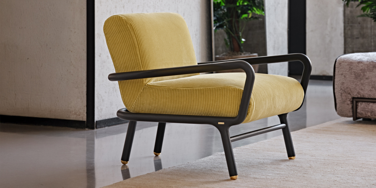 The delicate relevance of details: Girò is an armchair that can be the absolute centerpiece, as well as discreetly accompanying the most diverse living compositions with elegance. It stands for its structural lightness: the solid Ash wood seems to be bent with unexpected flexibility, in a harmony of lines and perfect angles matching the perfect size of the armrest. Not too much, not too little. The detail of the backrest and foot in polished gold finishing underlines the taste for style of those who choose Girò.