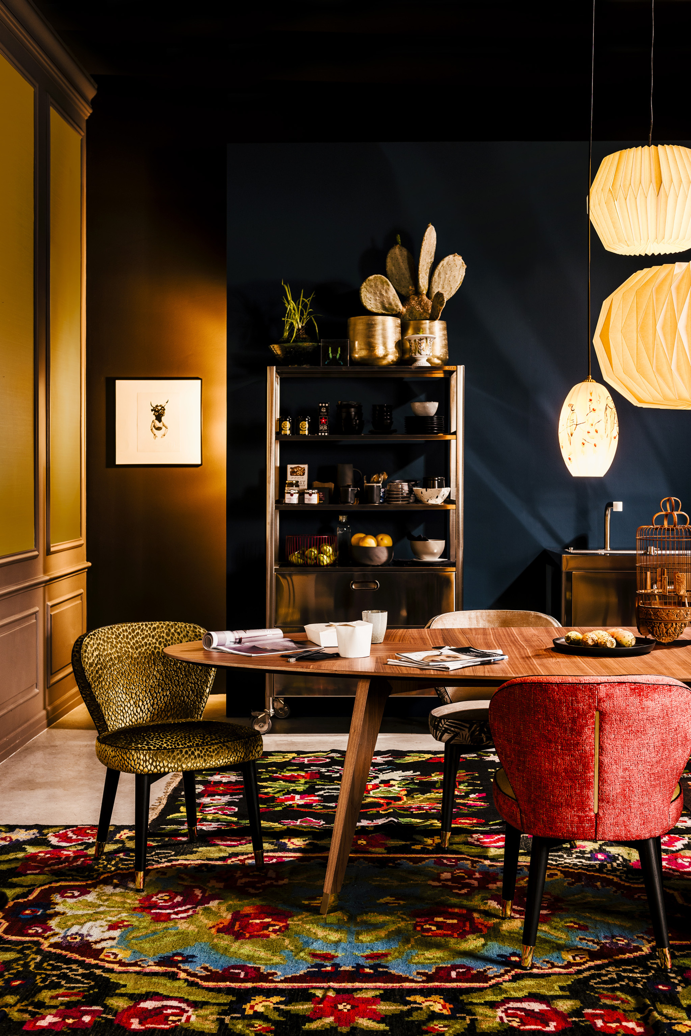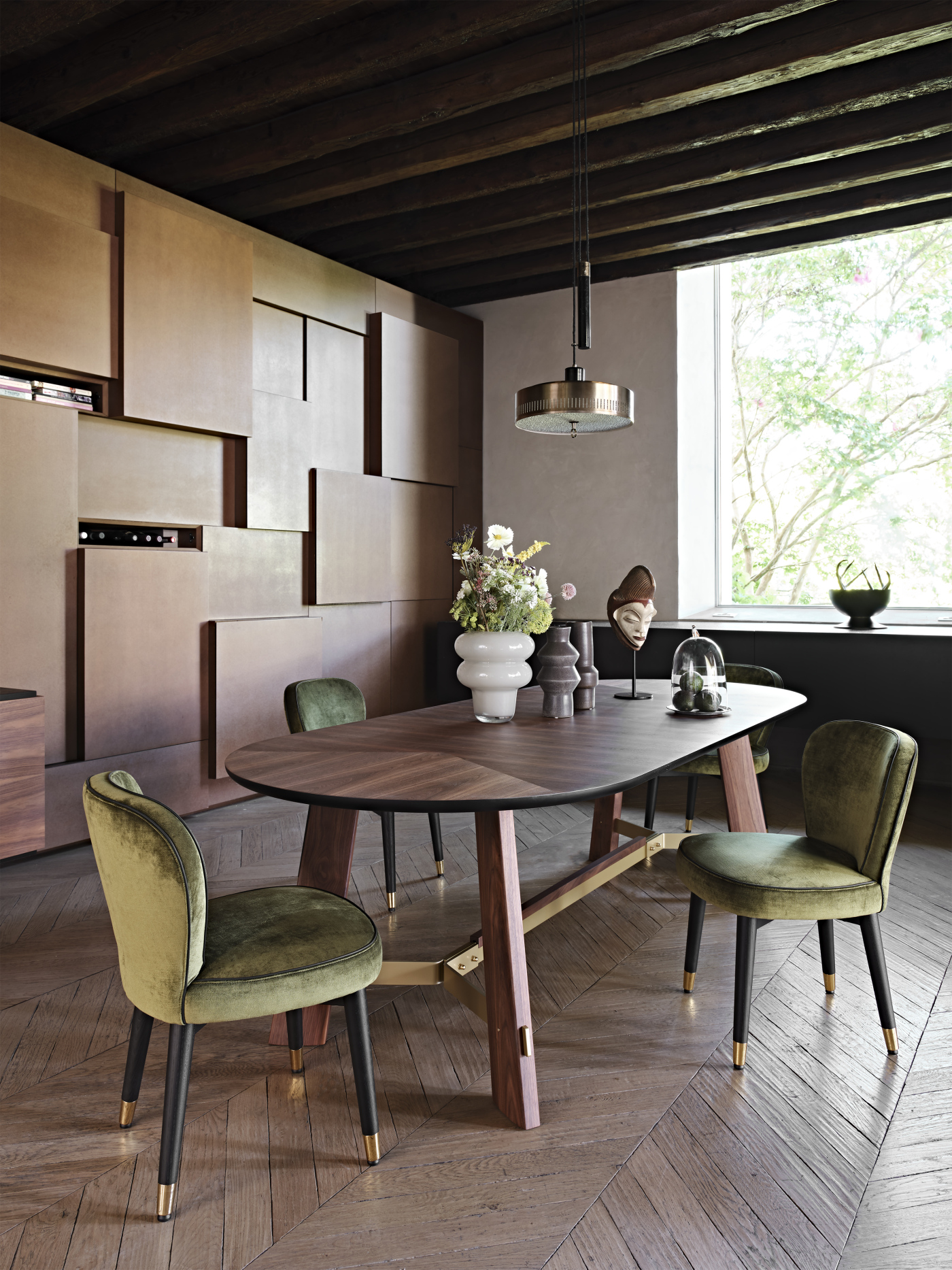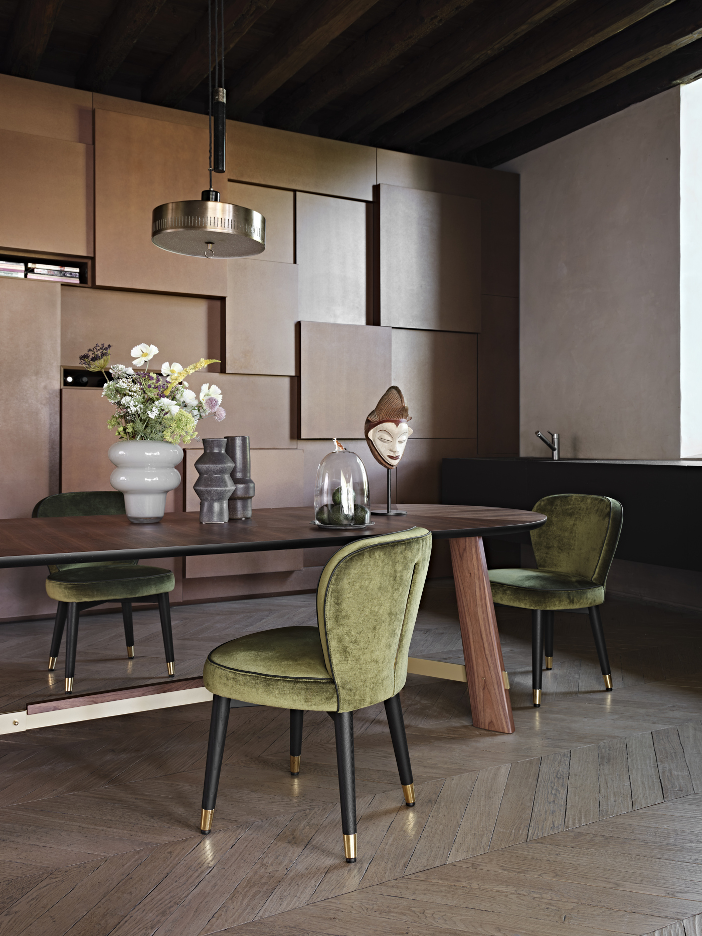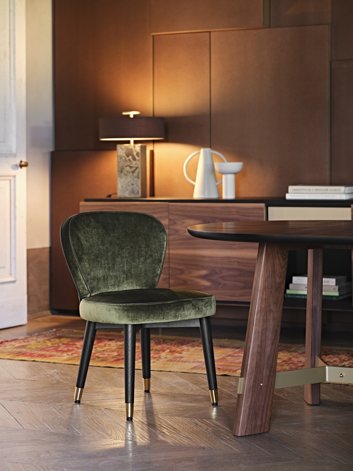 The Made in Italy touch is unmistakable and helps make this chair not only an element of innate modern beauty, but also a sophisticated must-have for refined design lovers. The comfortable and spacious seat rests on legs made of solid stained moka ash wood or canaletto walnut. The feet upholstered with glides in polished gold or dark bronze matt finishing, give the structure a touch of delicate charm. A concentrate of Italian excellence to be experienced.