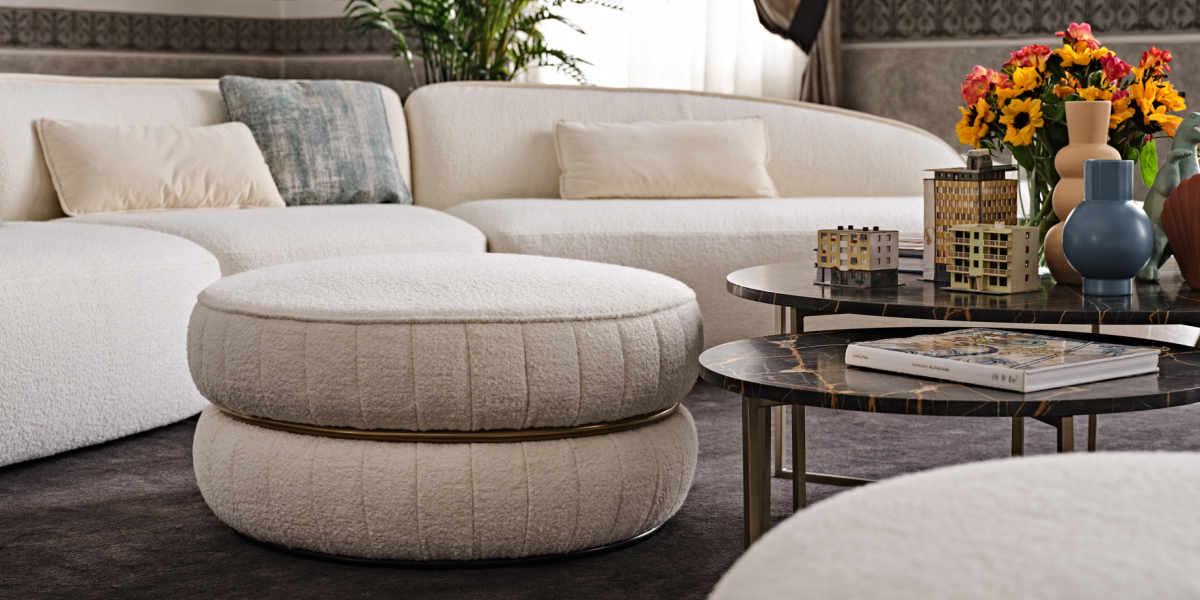 The prestige of a living environment is given by the balance of the objects composing it, in a soft game between functionality and aesthetics. Thanks to the versatility of its shapes and heights, Lillo brings elegance and comfort to the space in which it is placed. The metal ring with a matt gold finish embraces the softness of the fabrics, finished with precious ribbed stitching. A furnishing accessory that knows how to become a precious subject and object of desire.