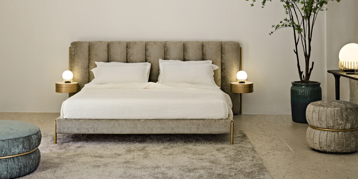 Black Tie elegance enters the home's most intimate and secret room: the Ibisco bed, with its softly sculptural headboard, is a refined and rigorous element that dialogues with silent majesty with the other elements in the room. The matt gold discreetly surrounds the details of the lines and the clever integrated bedside table system, which conceals the most precious secrets in the small rotating drawer. The finish of the back-lacquered glass top harmonizes with the fabric of the headboard, in contrast or agreement, according to its character.