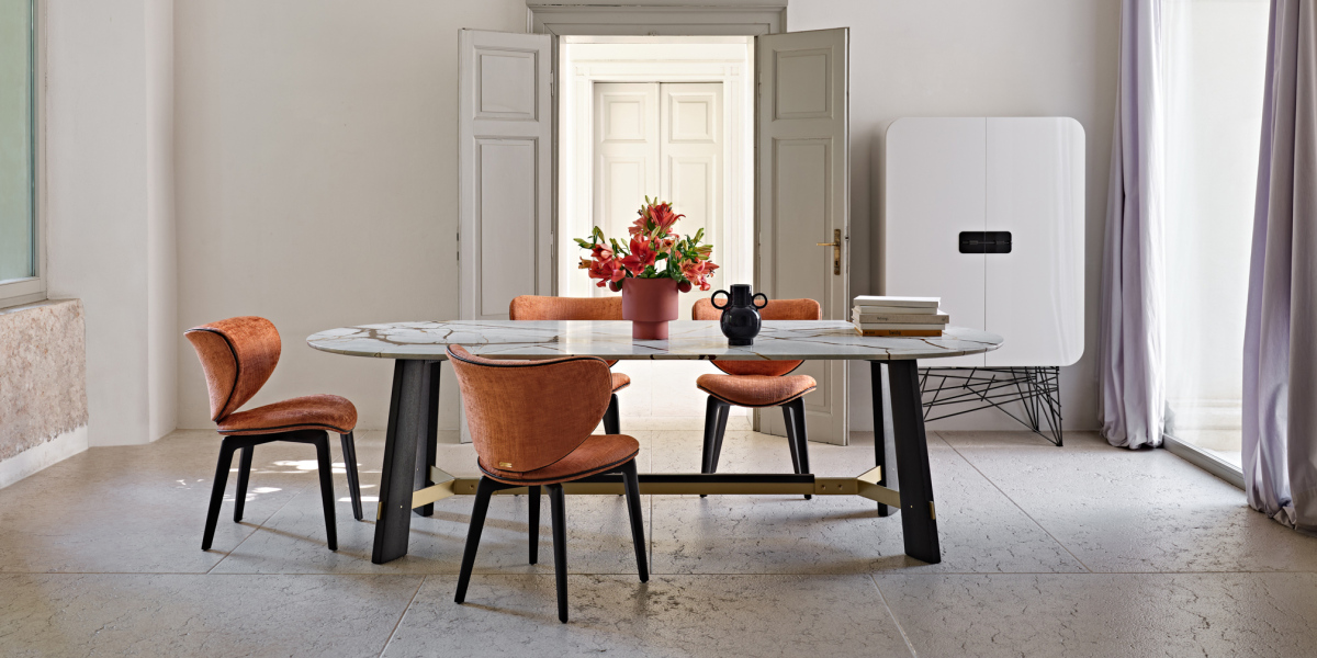 A tribute to the preciousness of marble, which expresses itself in all its material elegance thanks to the sinuosity of the oval line, defined by the lightness of the half-round edge: the Madison table, in the precious marble finishes chosen by Black Tie, lends sculptural grace to dining rooms and work environments. The refinement of the matt gold detail of the footrest is a precious style signature that seals the elegance of the support structure in Canaletto walnut or solid ash.