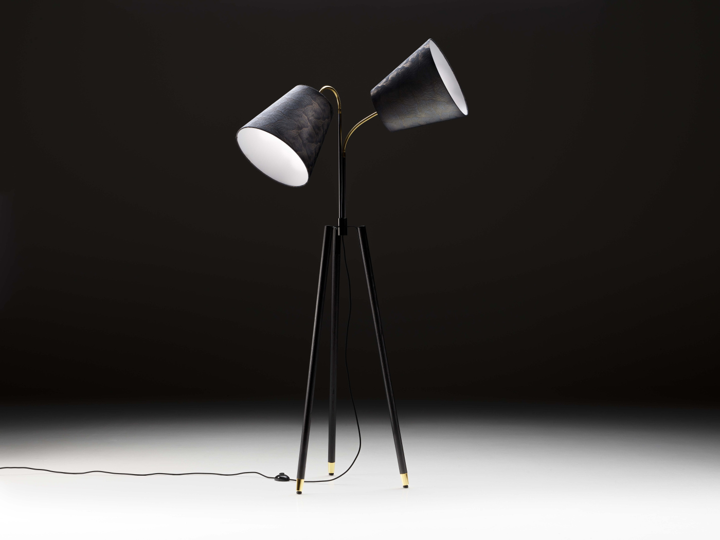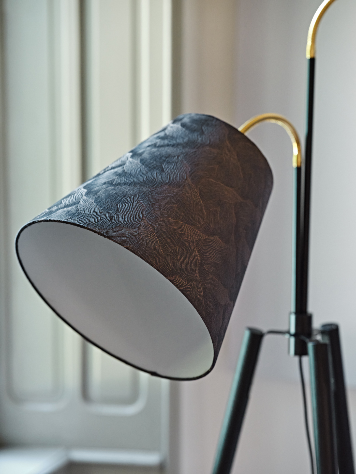 Bell a lamp that evokes cinematographic lighting: the two adjustable lampshades decorated with fine Black Tie fabrics enrich it, making it the star of the room. A solid ash wood tripod completes the lamp, giving a sense of lightness to the structure.