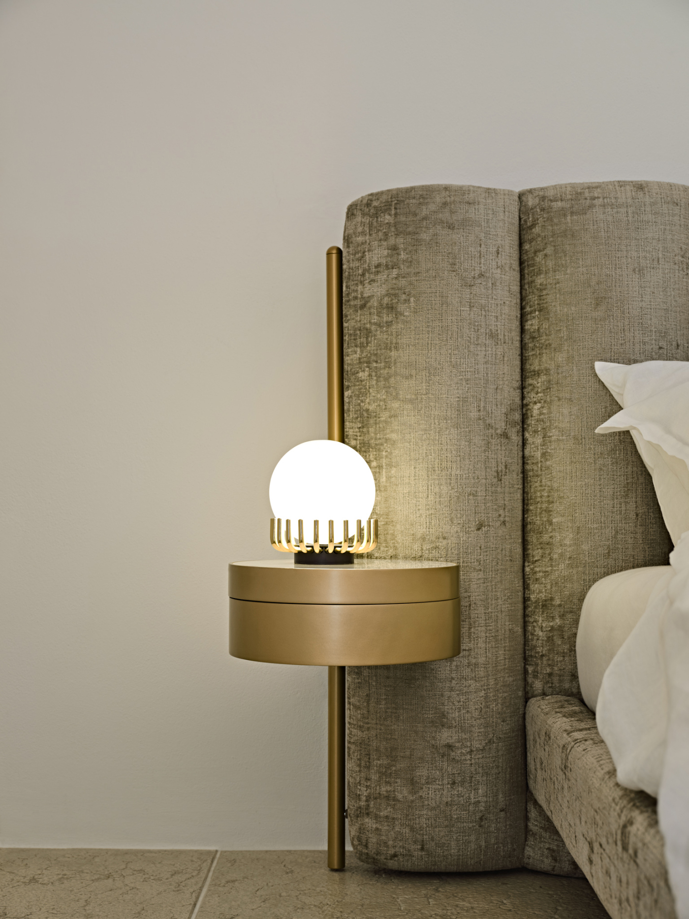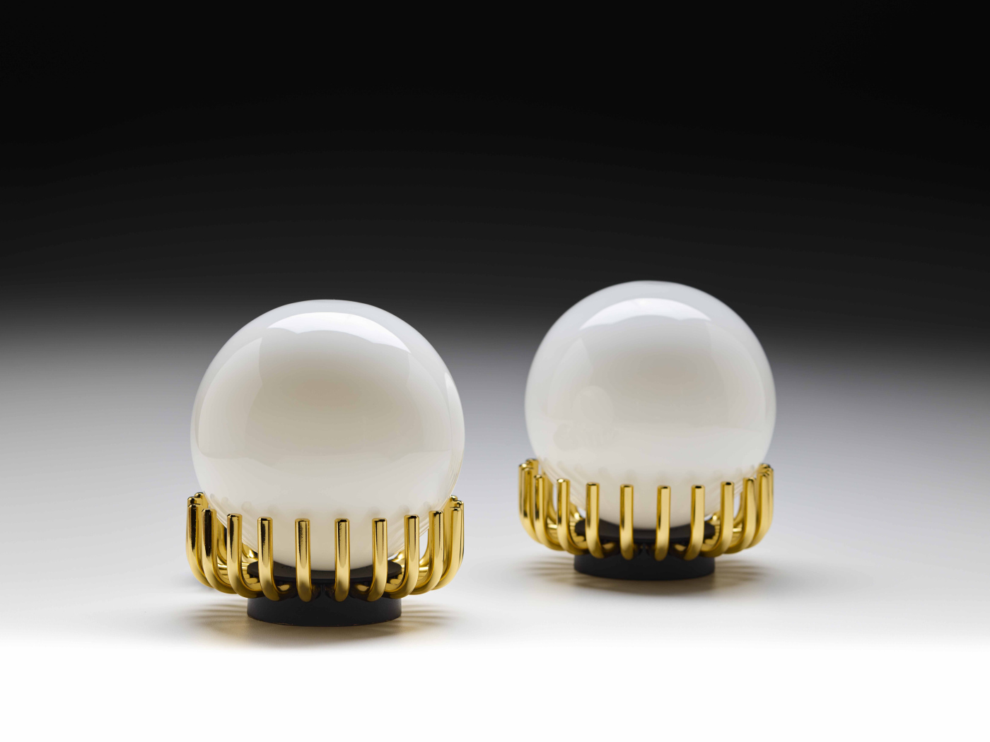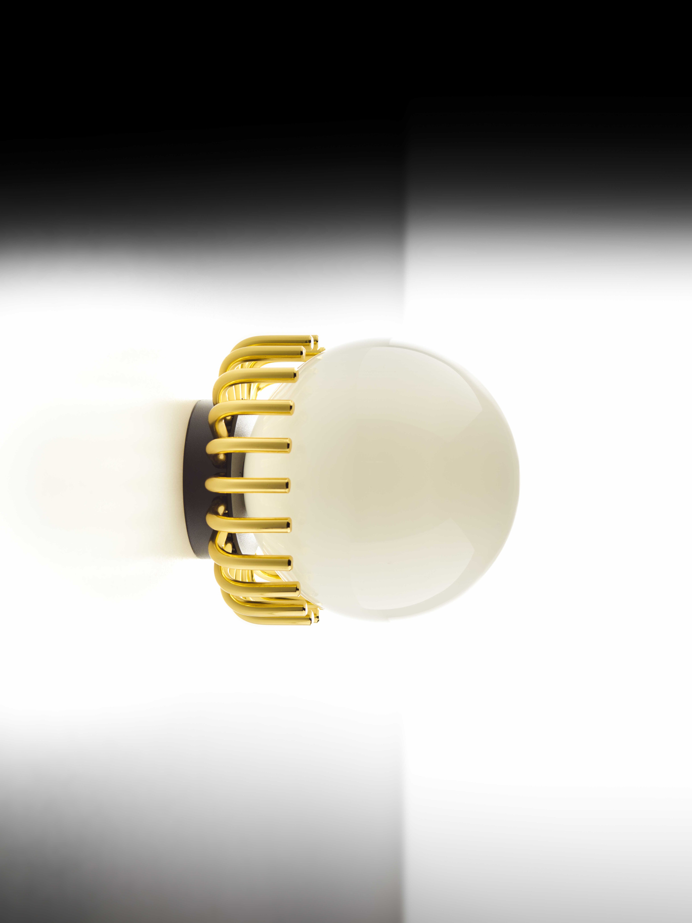 A discreet and functional point of light, which blends elegantly into the environment: Lucy Mini is an intelligent wall or table lamp system that skilfully combines the function of light with the decoration of space. The base in polished gold supports the sphere in shiny opaline glass with delicate lightness: a small and refined crown, which can give any environment elegant and regal luminosity.
