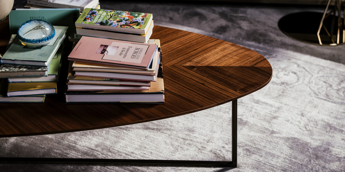 Oval coffee table with structure in metal, dark bronze matt finishing. The top is in Canaletto walnut. The line, clean and current, strikes for reducing the thickness that still transpires an unmatched solidity of materials. An evolution of the use of space with a minimal but elegant look. Italian design excels in finding a reality of furniture that becomes a perfect combination of simplicity and transversal.