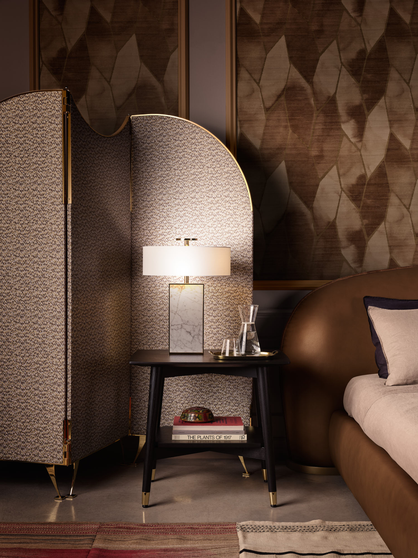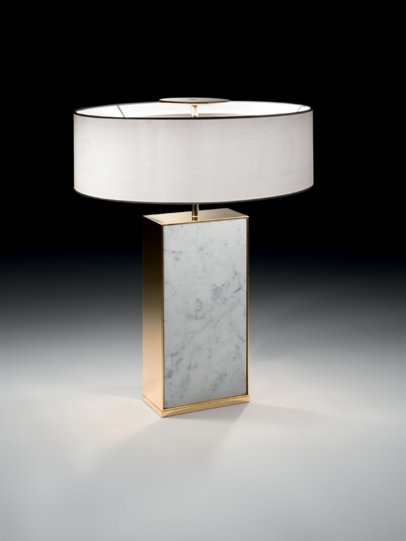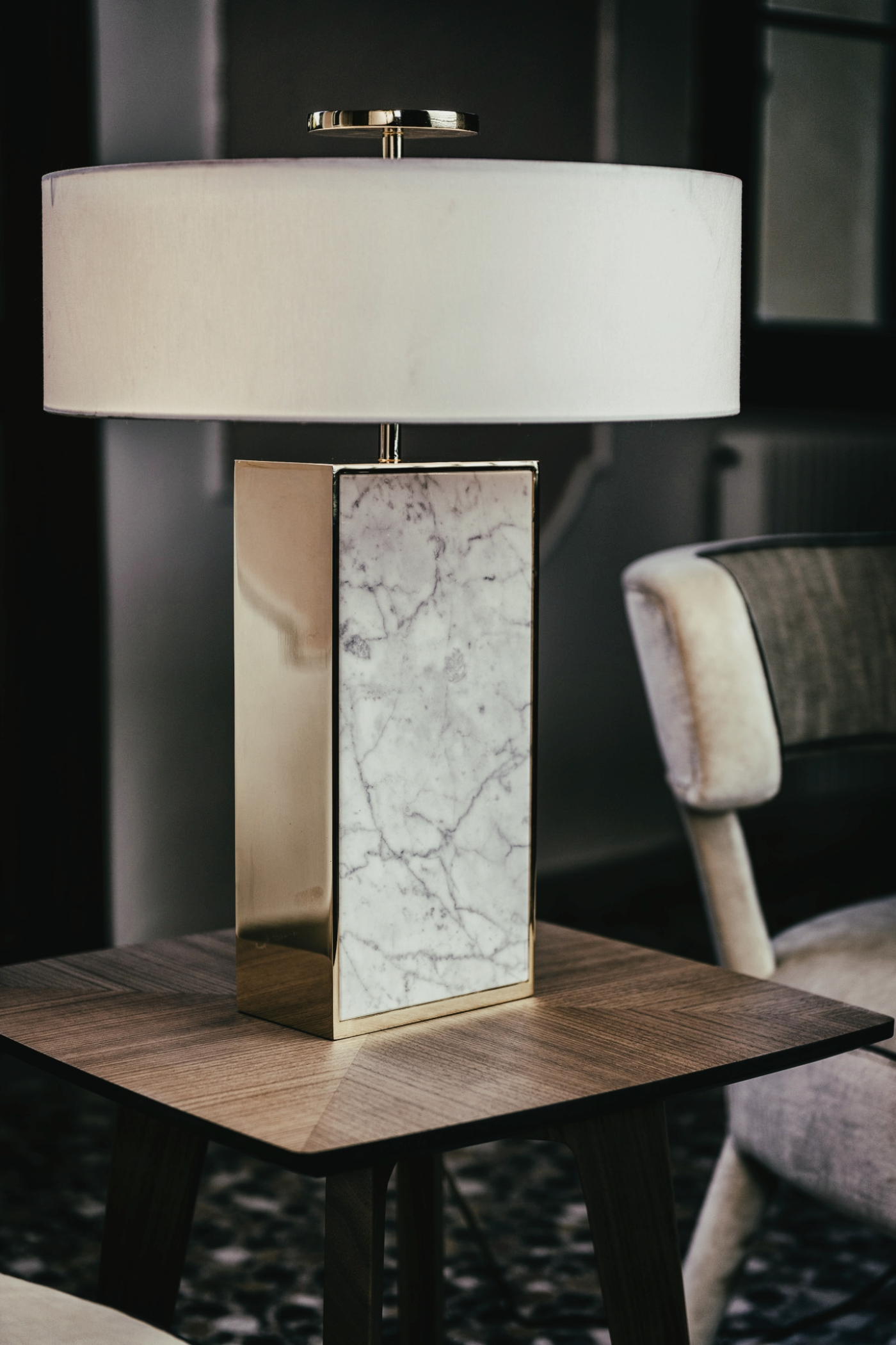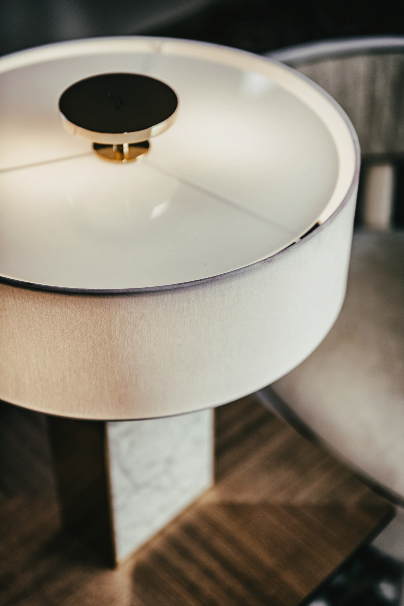 Simplicity is often synonymous with elegance, as is the case with Thelma. Table lamp for diffused or downward lighting produced with care to be a bright piece of furniture within the room. Its main body is made of Carrara marble, while the metal parts are in polished gold finishing. This detail gives Thelma a bright vitality. The lampshade with stiff fabric is the finishing touch of a balanced and eye-catching shaped element.
