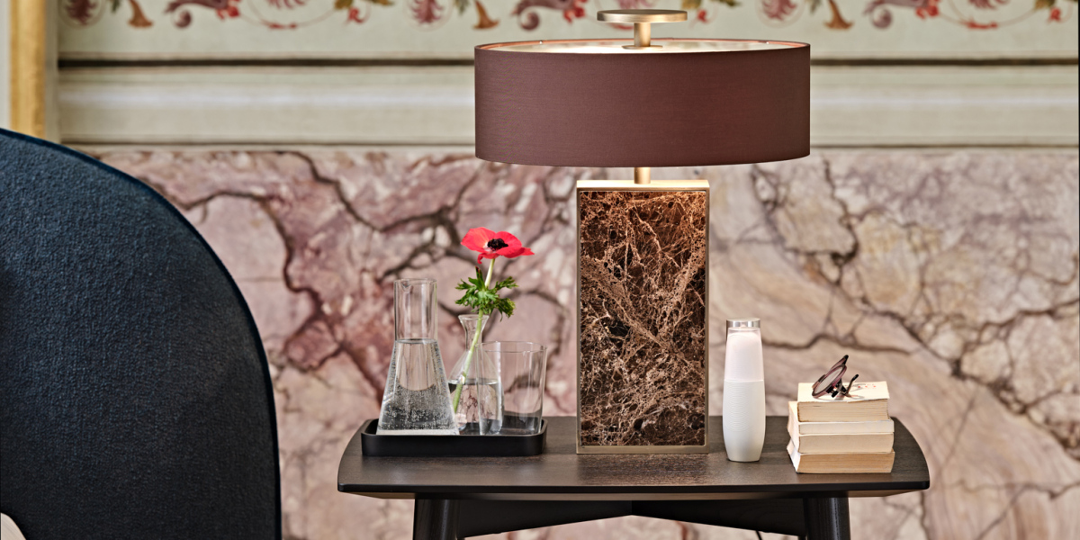 Statuesque, elegant, distinguished: the luxury of Emperador marble, framed in a thin sheet of matt dark bronze, becomes an icon of style thanks to the soft light infusing the raw material with natural beauty. The lampshade, available in brown hard fabric, makes the composition even more precious, and it fits as a unique furnishing element in the most diverse settings.