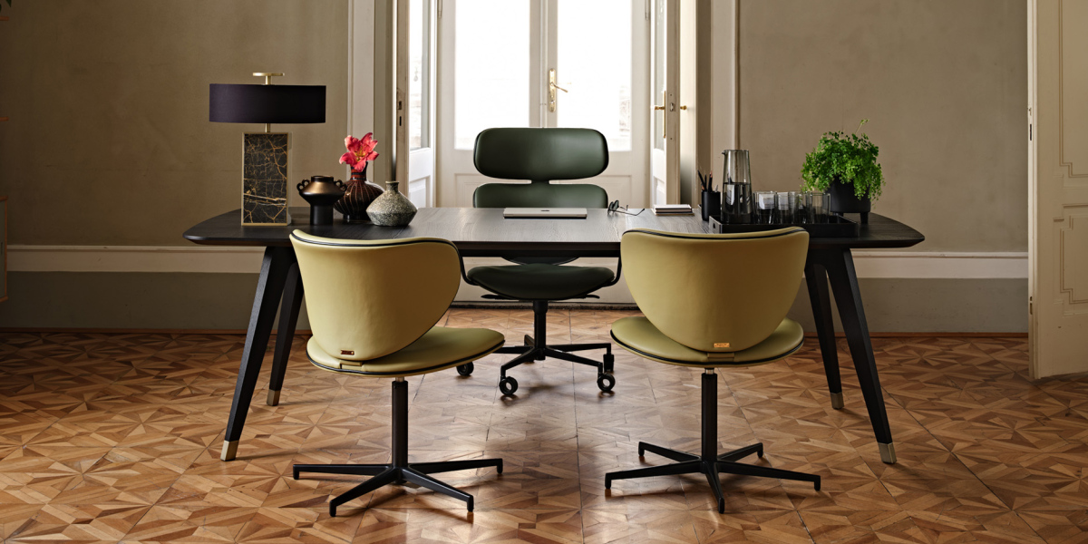 Praticità ed eleganza: Asia Office è la combinazione concepita per donare comfort e prestigio al proprio luogo di lavoro. L’ergonomia dell’oscillazione e del sistema elevante, abbinato alle 5 ruote gommate, conferisce ineguagliabile dinamicità alla struttura. La pregiatezza dei pellami, il bracciolo nero opaco e i colori BlackTie completano la composizione: perché le idee che nascono avvolte nella bellezza sono foriere di risultati prestigiosi.