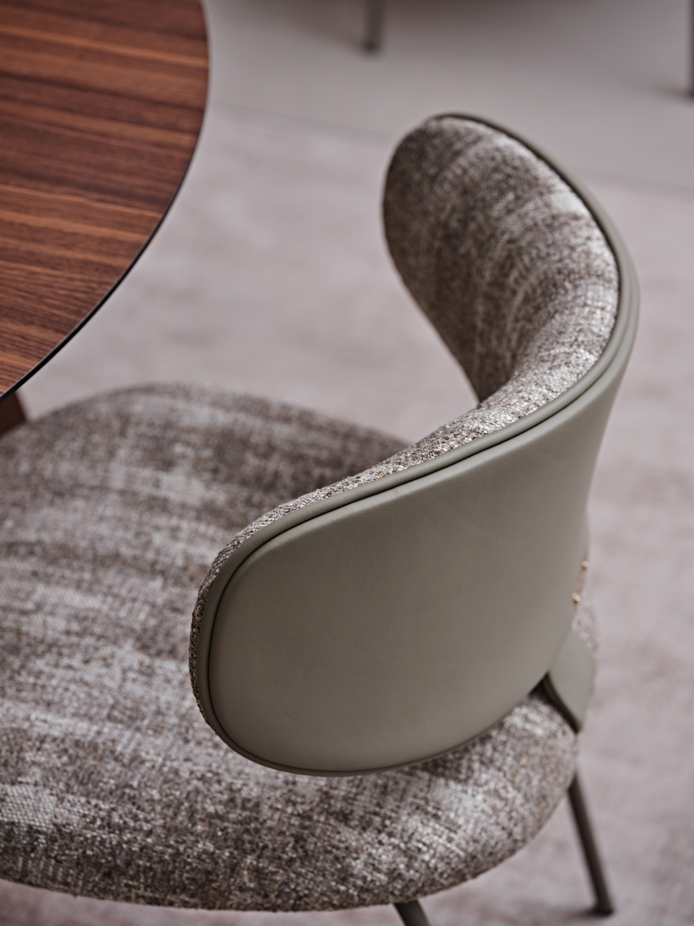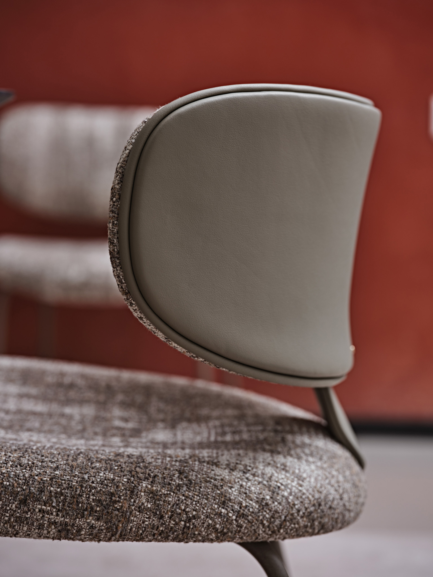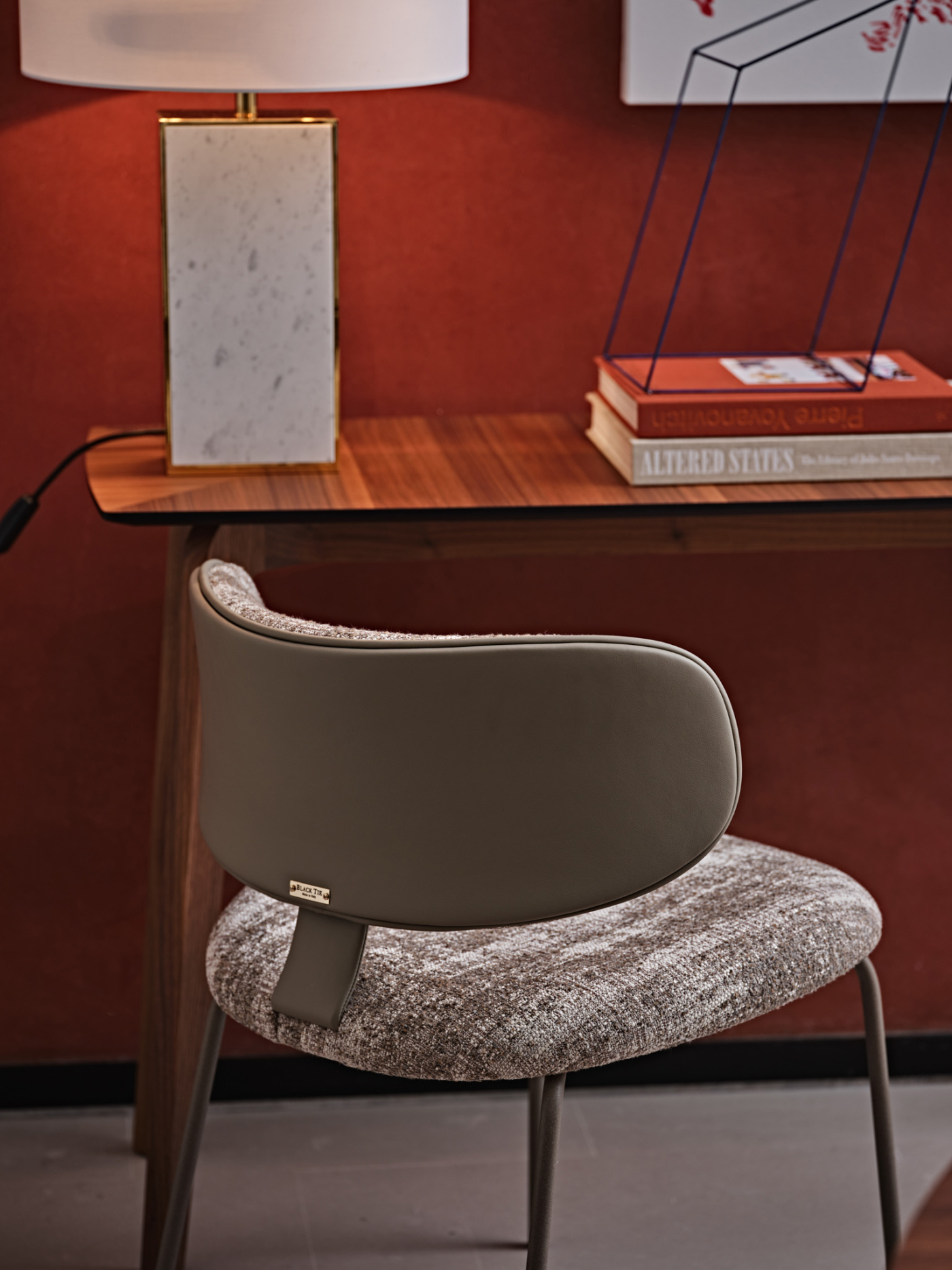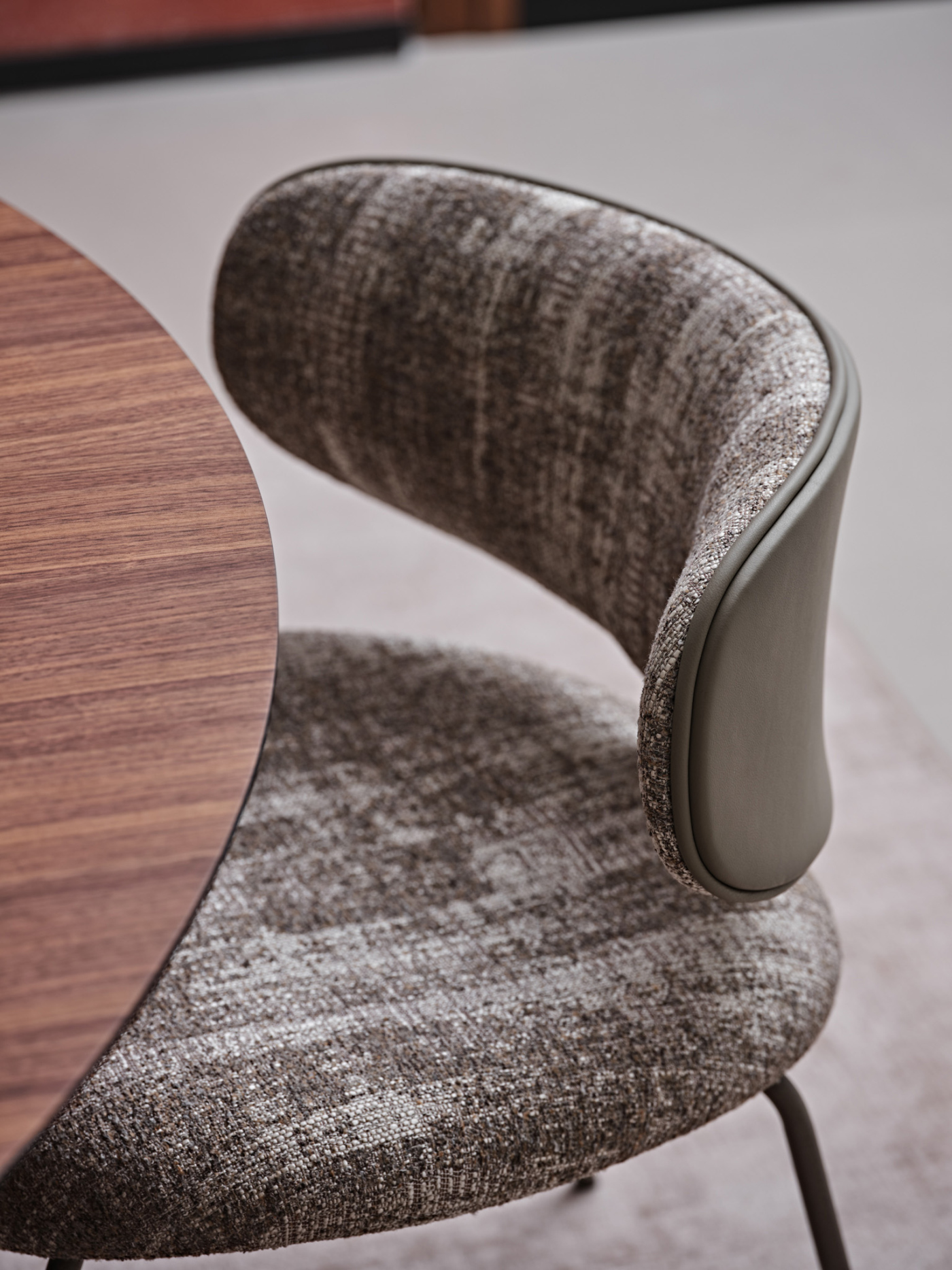 Semplicemente essenziale: Natalia è pura forma e tessuto. L’inclinazione della seduta si accompagna in modo armonico e complementare allo schienale, che avvolge e sostiene con delicata eleganza. La qualità dei tessuti e dei pellami, personalizzabili su una variegata e pregevole scelta di finiture, è ulteriormente impreziosita dai richiami dei dettagli in ecopelle, che accompagnano con armonia la struttura in metallo verniciato.