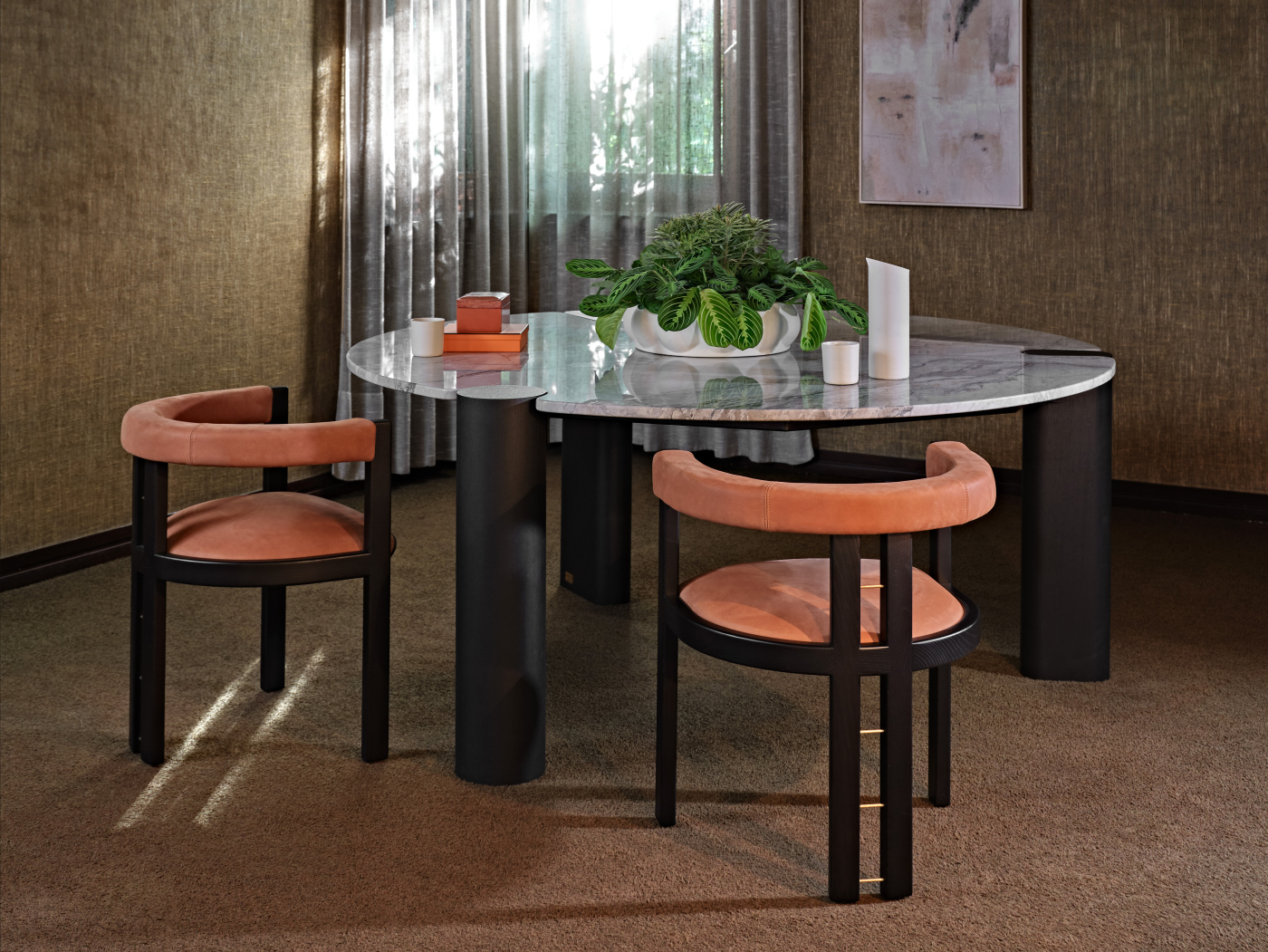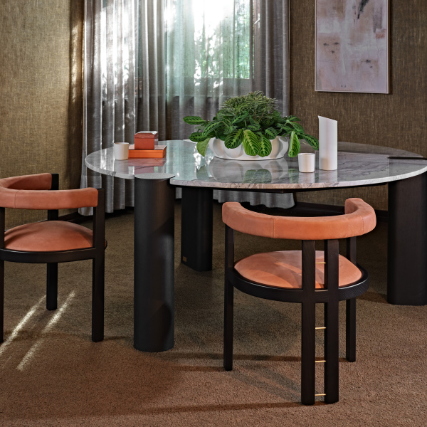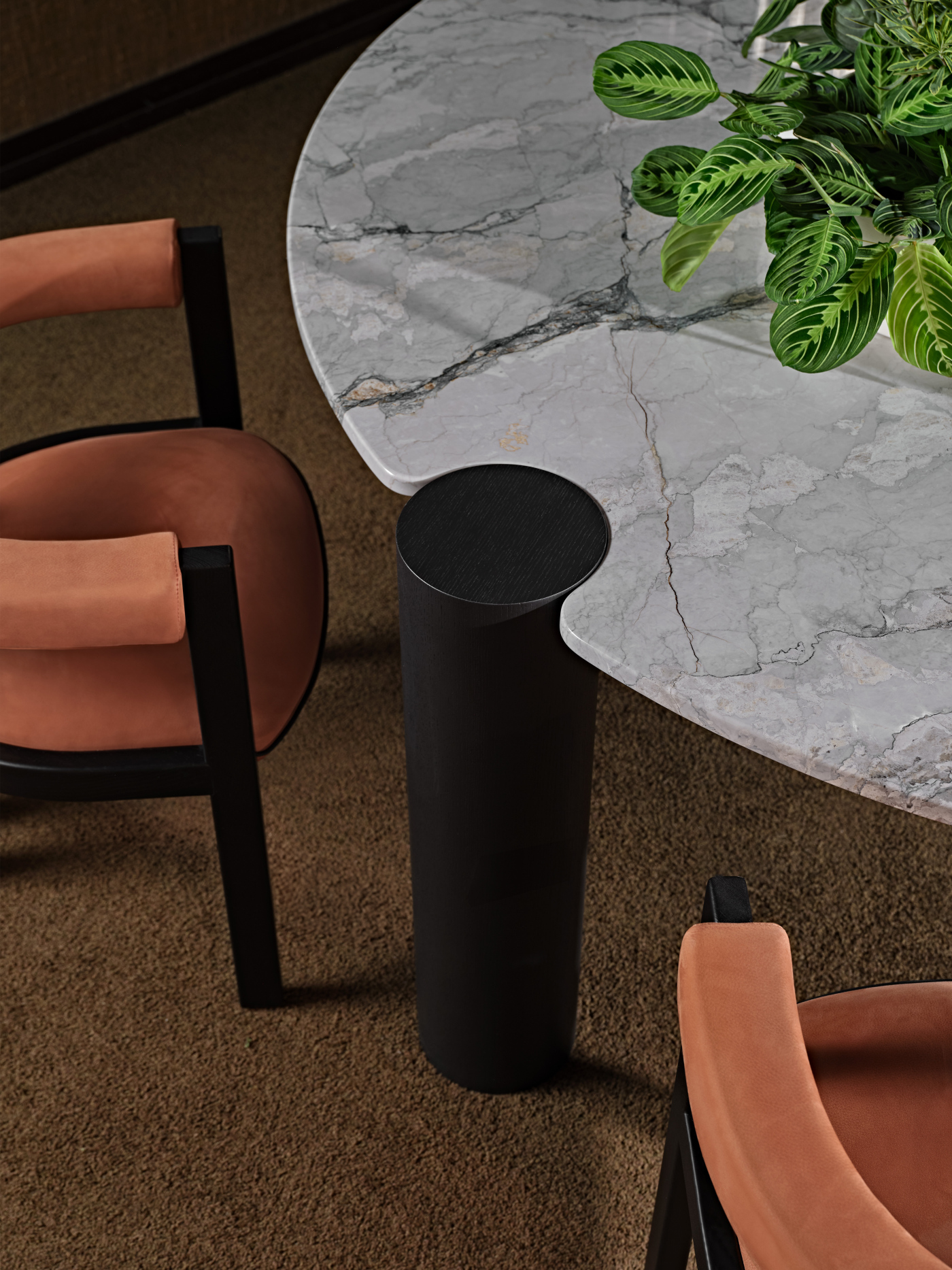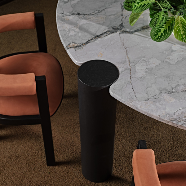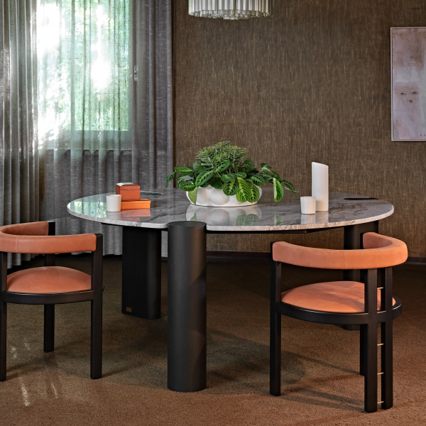 Materia sospesa in un equilibrio gravitazionale: il pregio del tavolo Amoris è nel gioco di forme perfette, che si alternano armoniosamente nel sostenere, in un’illusoria assenza di peso, la pre-gevolezza del marmo e della quarzite. Materiali preziosi in incastri raffinati, che sanno sottoline-are con plastica eleganza le scelte di stile che ge-nerano stupore.