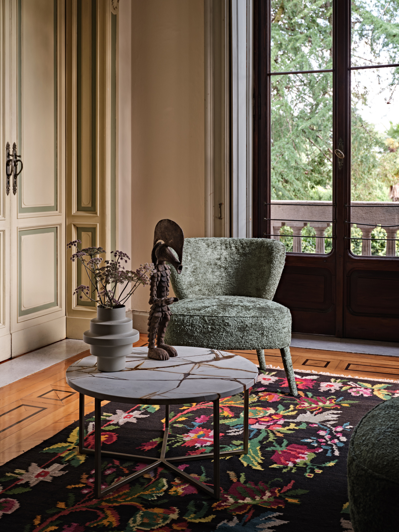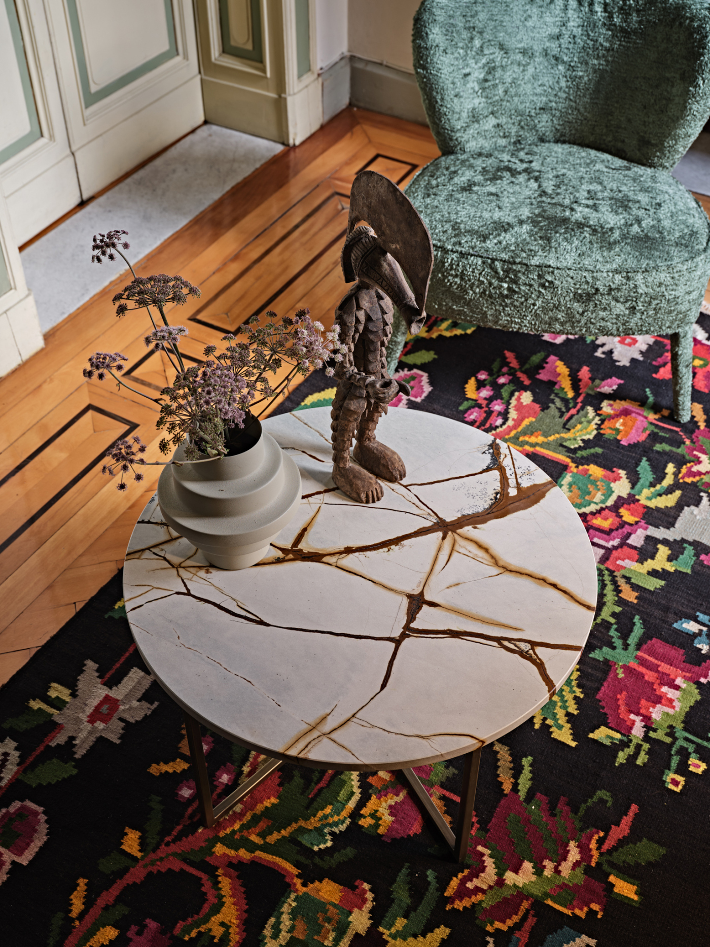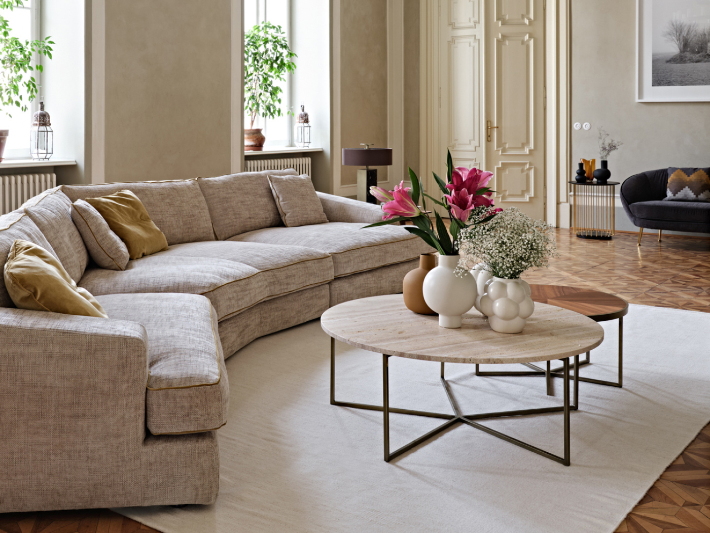 Una danza tra i pianeti. Questa è la prima sensazione che regalano i tavolini Elliot appena si mostrano in tutta la loro eleganza. La struttura in metallo volteggia sinuosa e leggiadra attorno al piano in marmo, corredato da finiture in bronzo scuro opaco. Un'armonia di forme che dona allo stesso tempo praticità e raffinatezza, lasciando spazio a molteplici possibilità di utilizzo e di collocazione. La versione da 35 cm regala, inoltre, la possibilità di avere il top in finitura di bronzo scuro opaco o oro lucido.