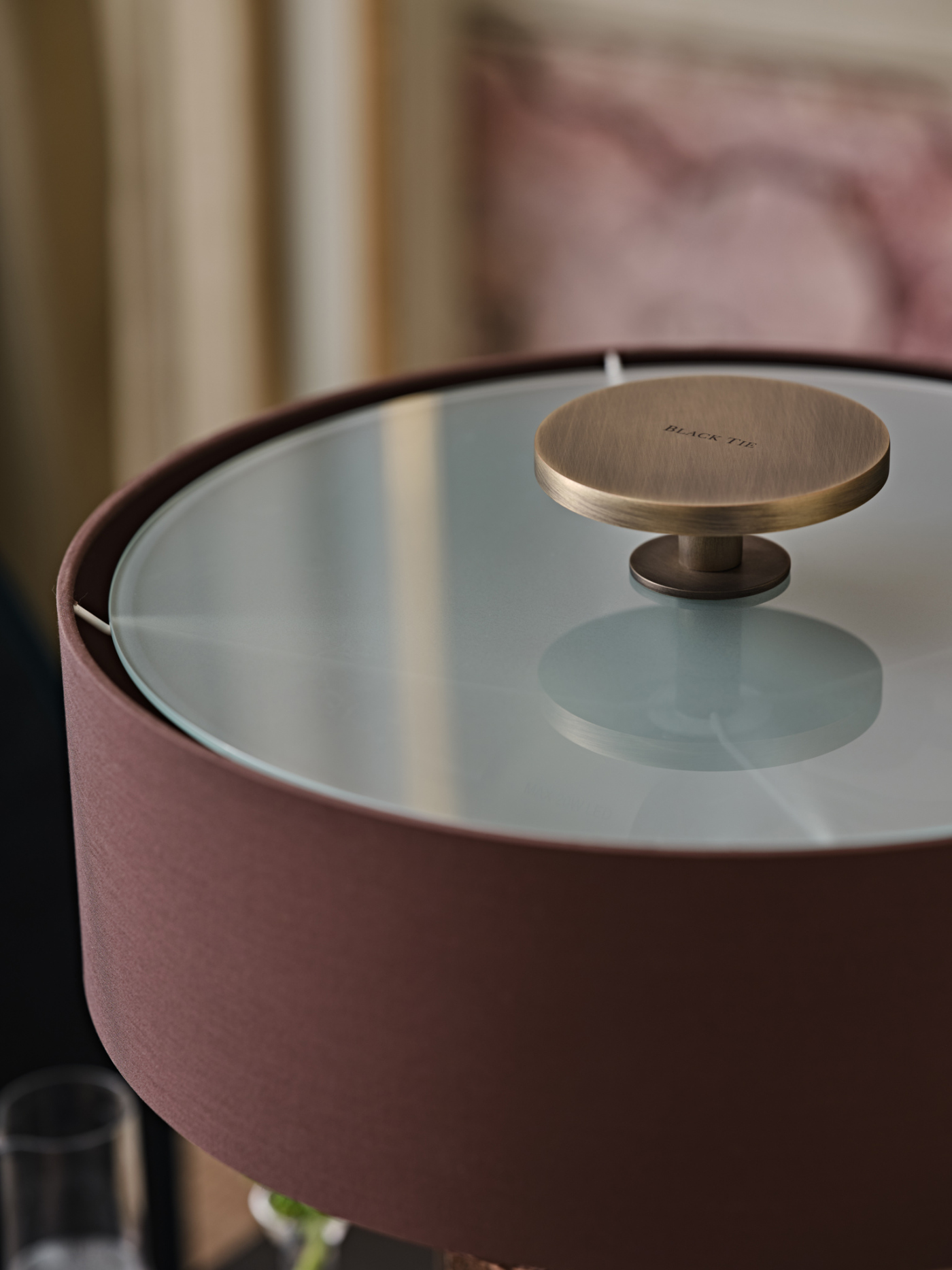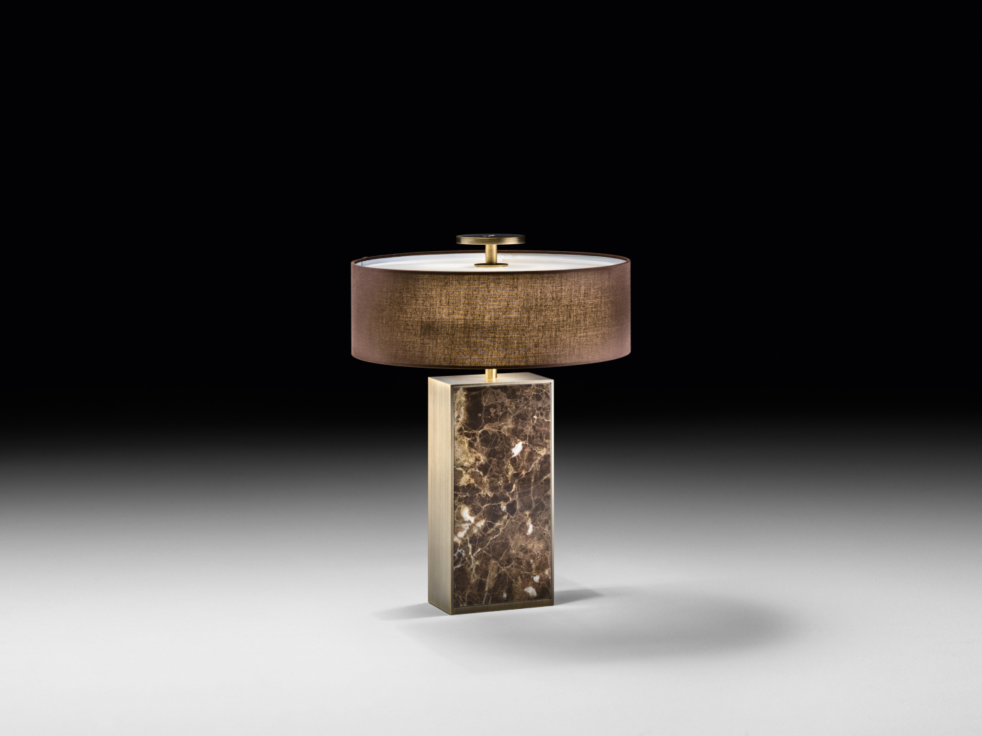 Statuaria, elegante, importante: la lussuosità del marmo Emperador, incorniciato in una sottile lamina di bronzo scuro opaco, diventa emblema di stile grazie alla luce soffusa che inonda di naturale bellezza la materia prima. Il paralume, disponibile in tessuto marrone, rende ancor più preziosa la composizione, che si inserisce come elemento di arredo unico nei più diversi contesti.